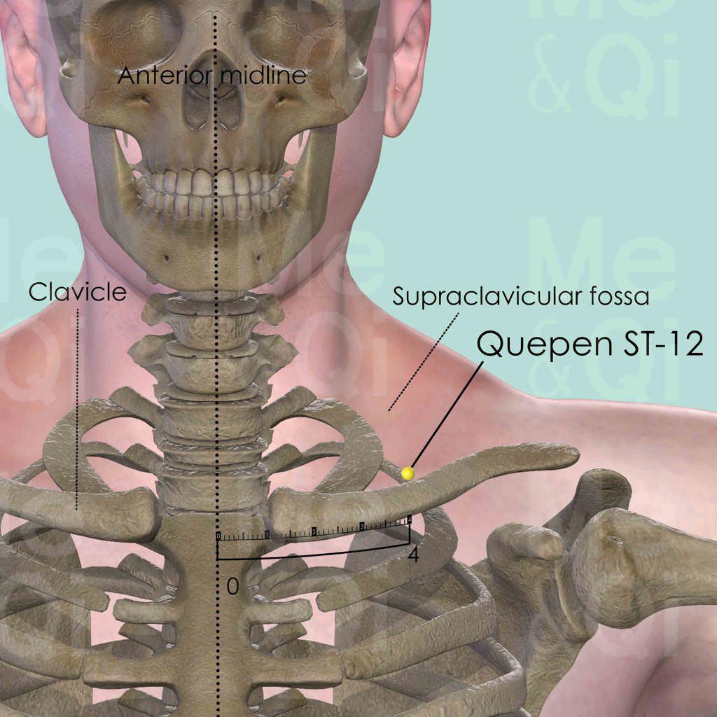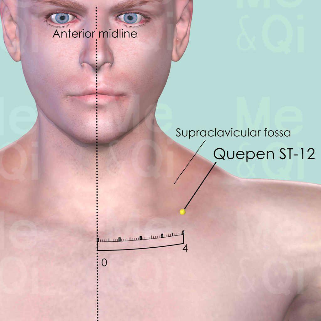From the anterior midline, palpate 4 cun along the clavicle to the midpoint. Quepen ST-12 is located at the upper border of the clavicle in the supraclavicular fossa, lateral to the clavicular head of the sternocleidomastoid muscle.