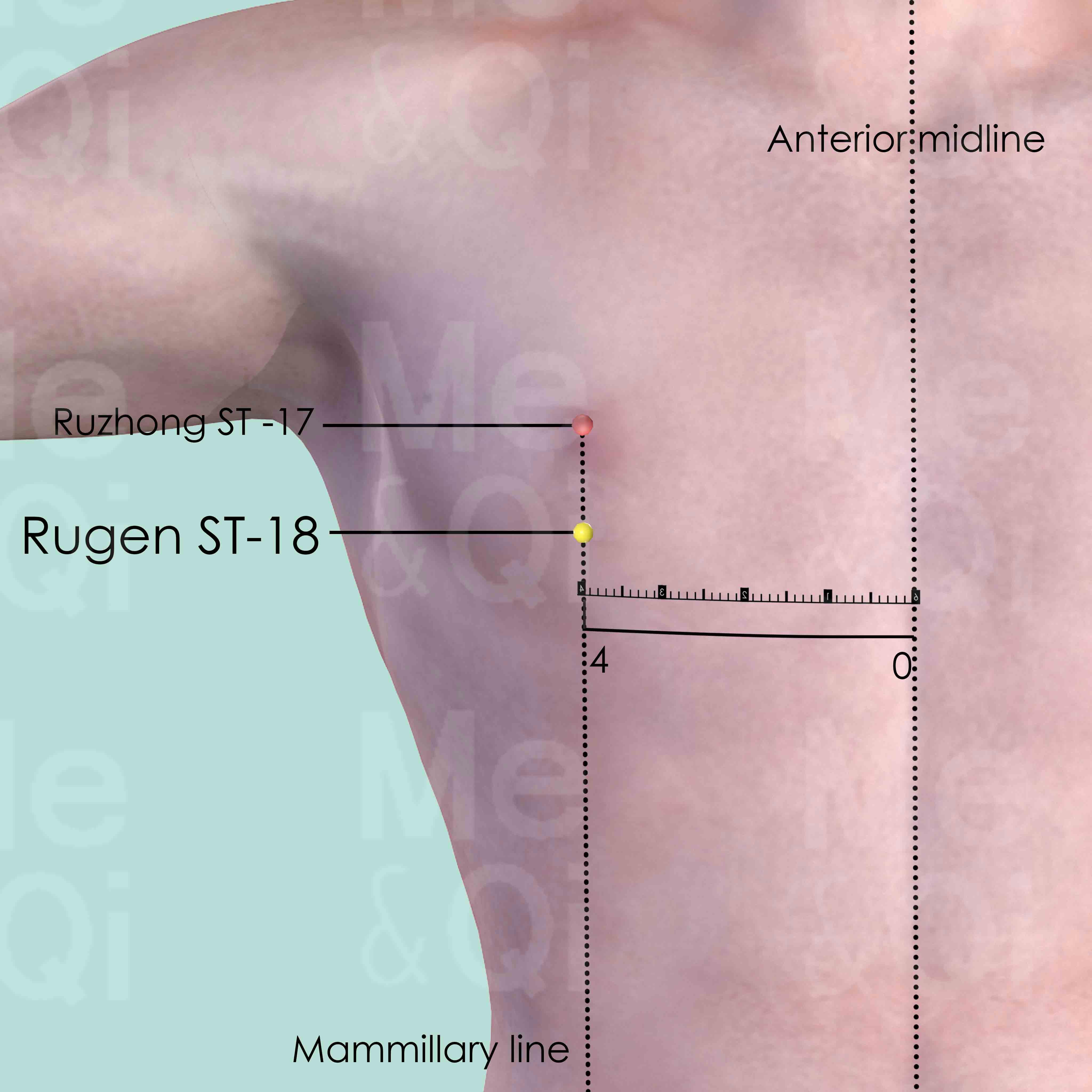 Rugeng ST-18 is locate on the mamillary line, which is 4 cun lateral to the anterior midline. The nipple (Ruzhong ST -17) is mostly located on the 4th intercostal space, while ST-18 is one intercostal space directly below the nipple. In women, ST-18 is normally found at the root of the breast.