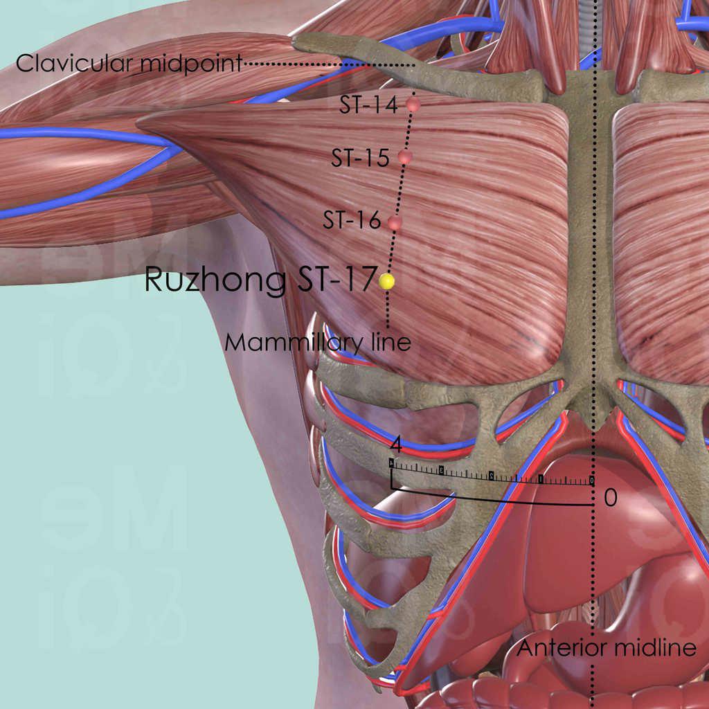 Contradicted for needling or any other type of therapies. Ruzhong ST-17 is only used for location reference.