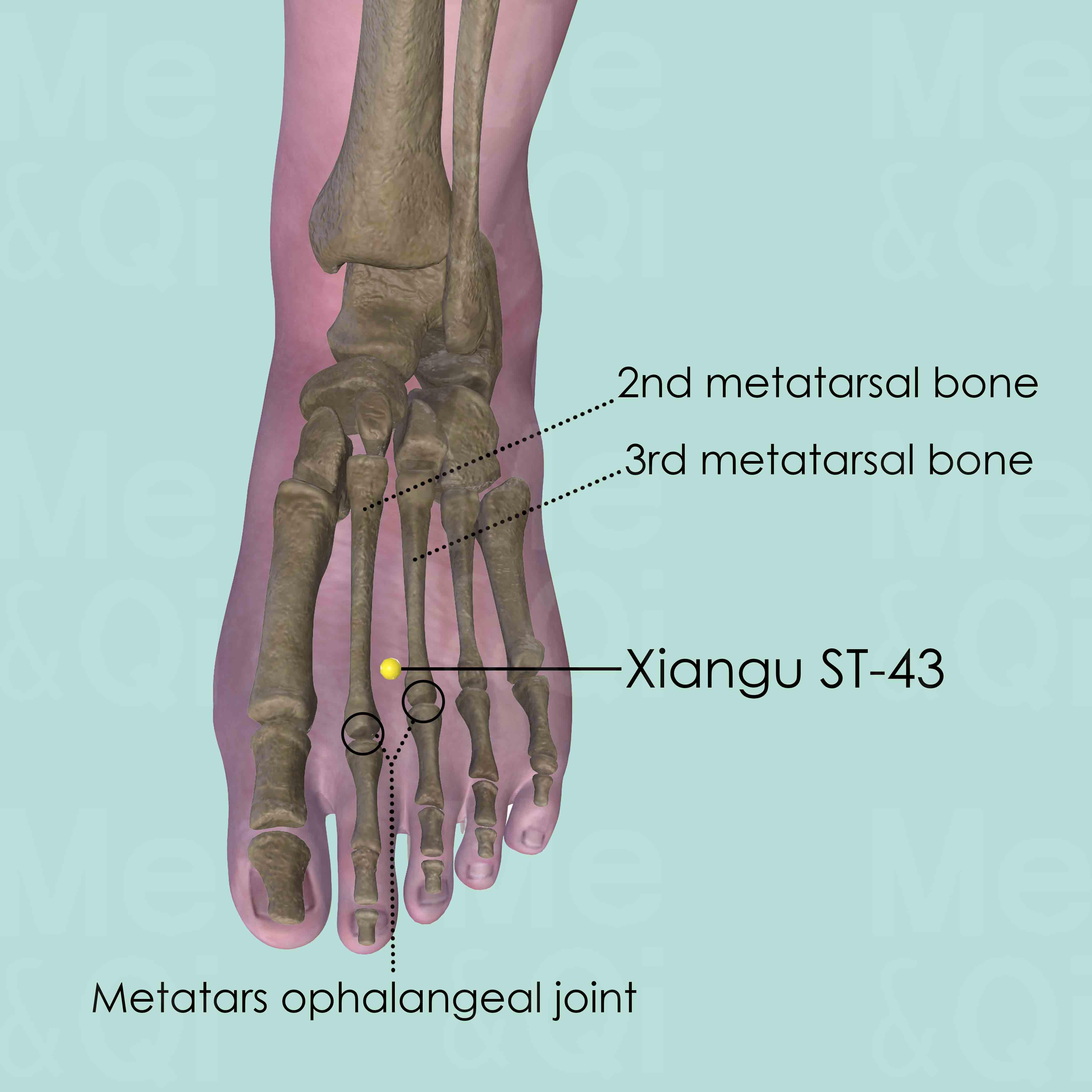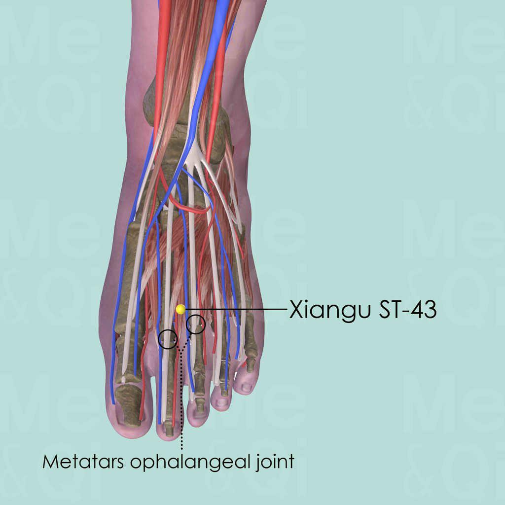 Locate Xiangu ST-43 in a depression proximal to the metatarsophalangeal joint, by gliding finger from toe to ankle between the 2nd and 3rd metatarsal bones. It is more or less on the same level as the junction of the shafts and the heads of the two metatarsal bones.