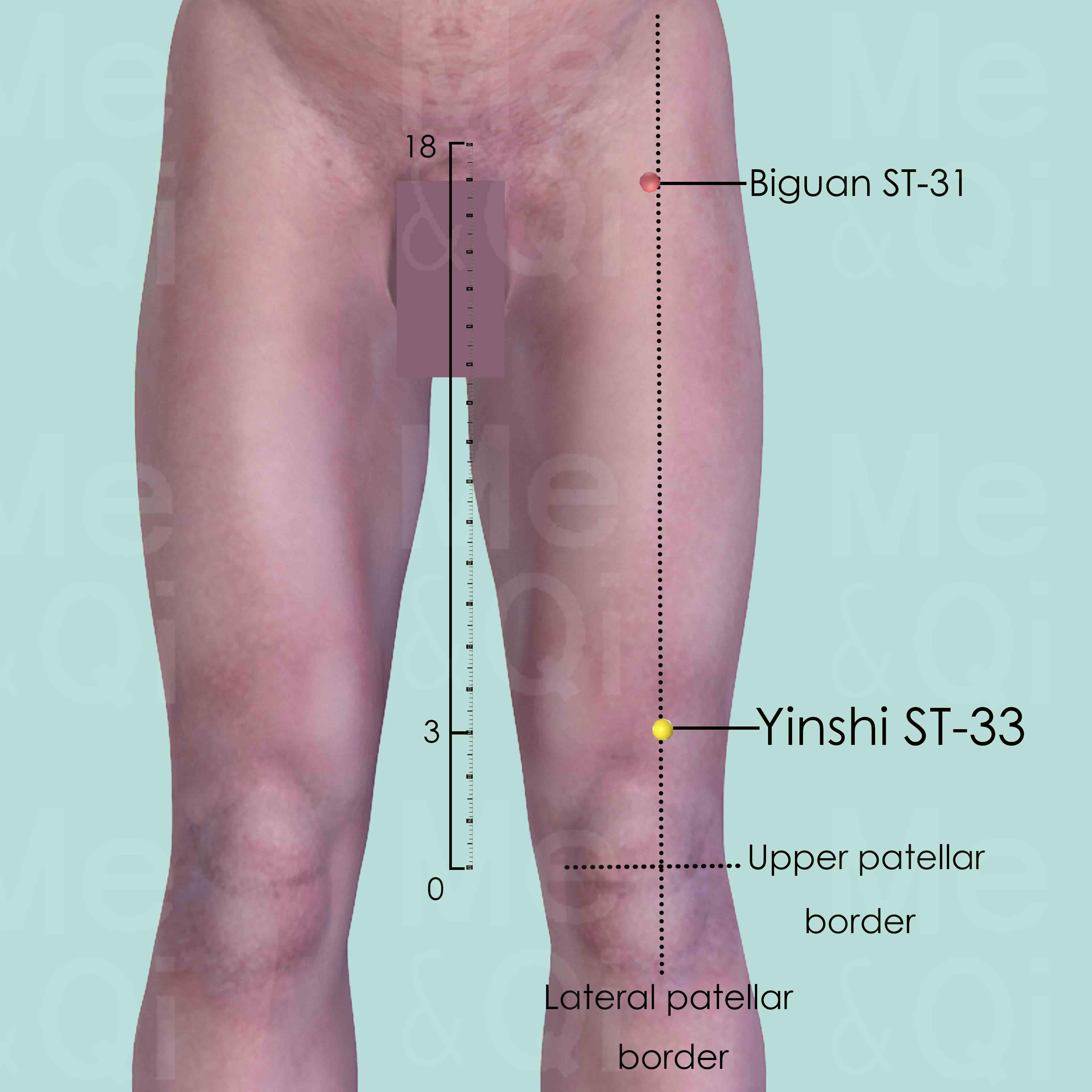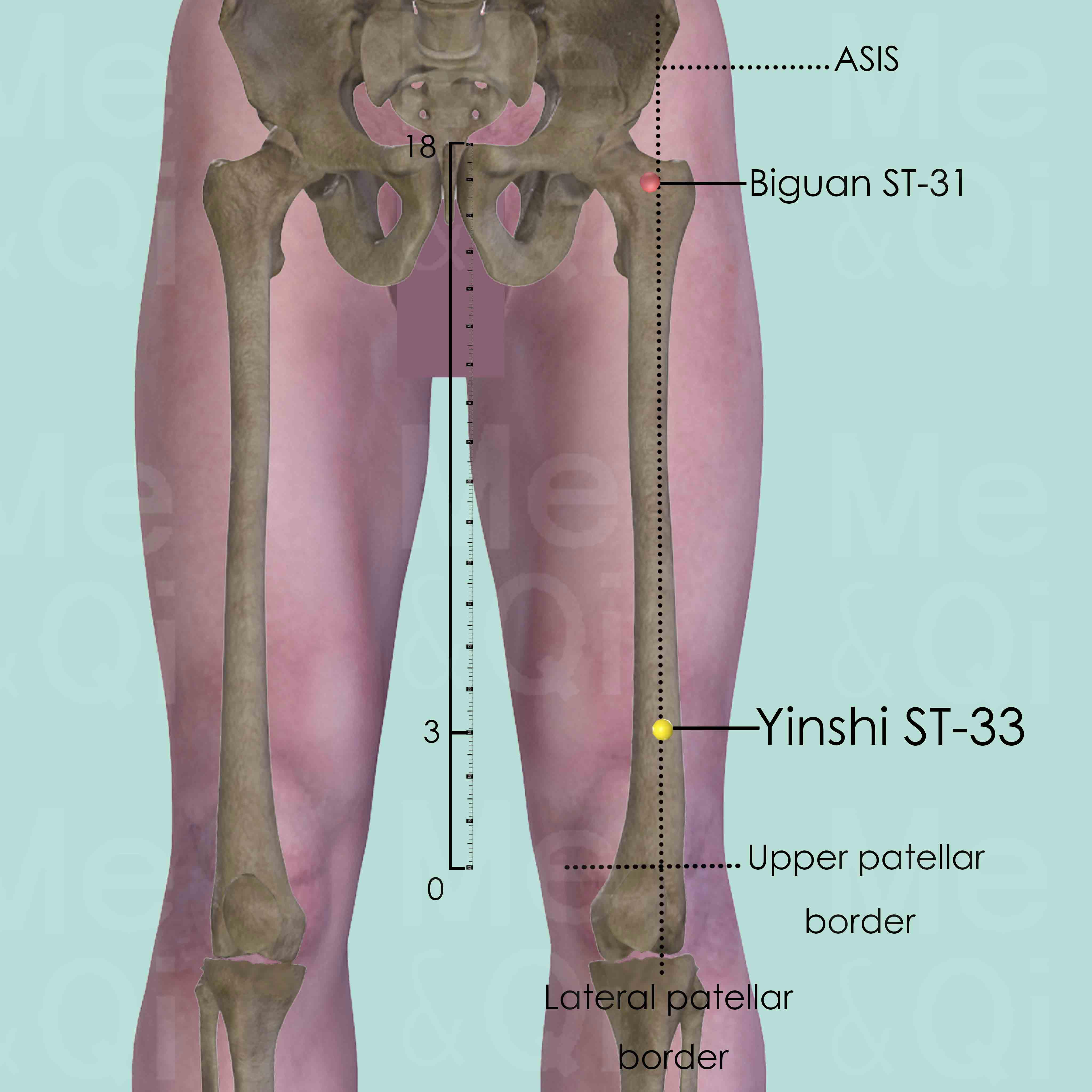 Identify the anterior superior iliac spine (ASIS) and the upper lateral patellar border. Draw an imaginary line between these two points and Yinshi ST-33 is located 3 cun above upper-lateral border of the patella on the line.