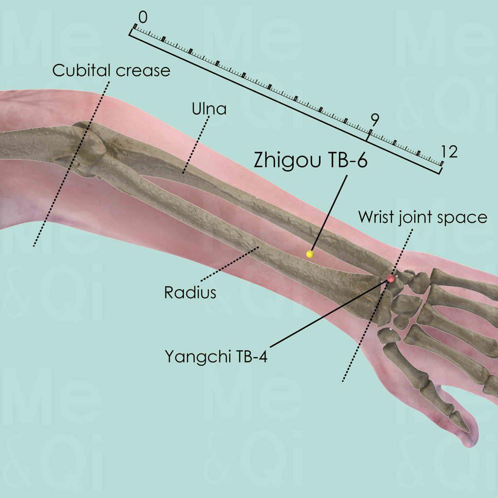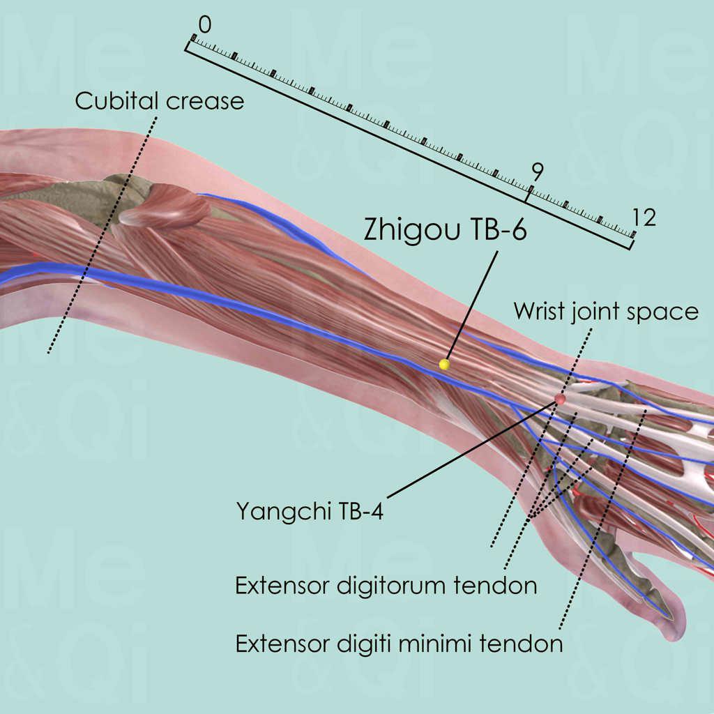 First identify Yangchi TB-4. Move the wrist in a relaxed way so that the joint space is more visible. TB-4 is located laterally to the joint space midpoint, in the depression between the tendons of the extensor digitorum and extensor digiti minimi muscle, which continues to the litter finger. Zhigou TB-6 is located 3 cun above Yangchi TB-4.
