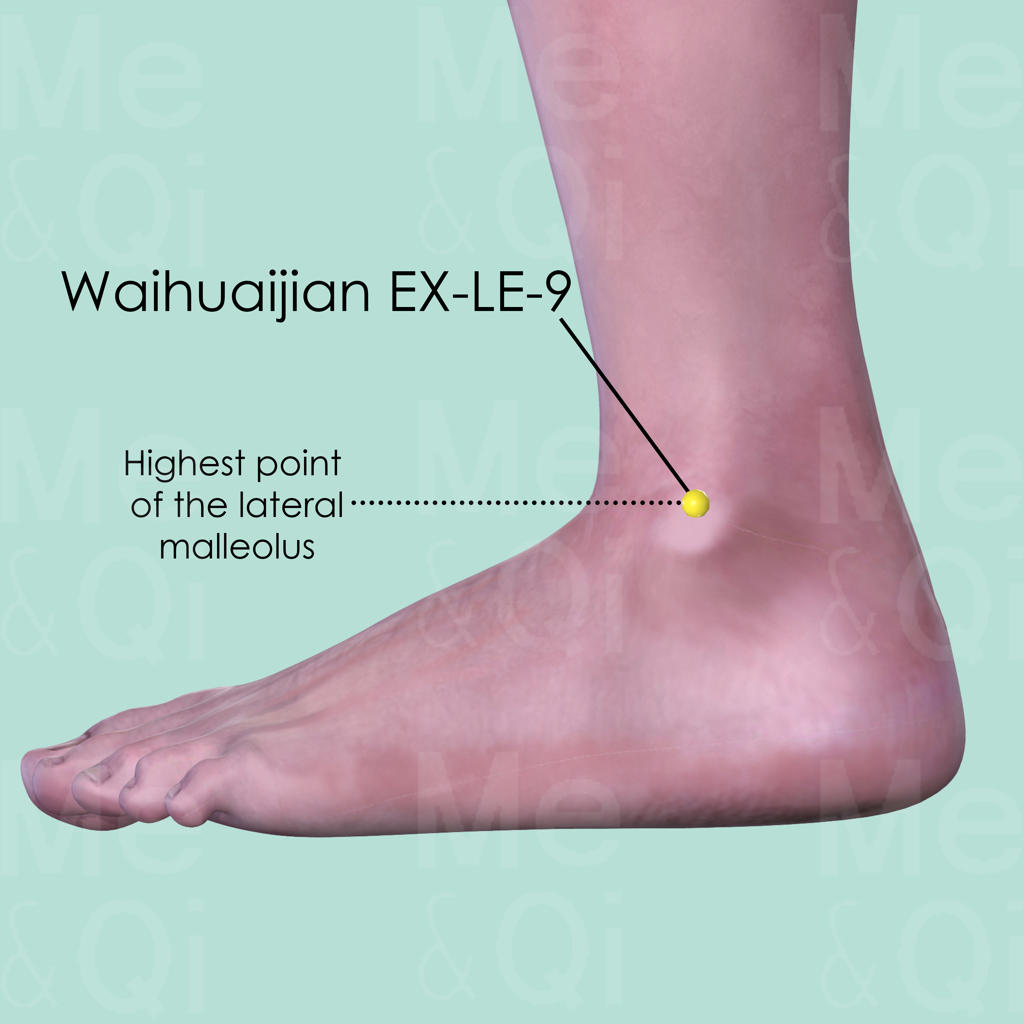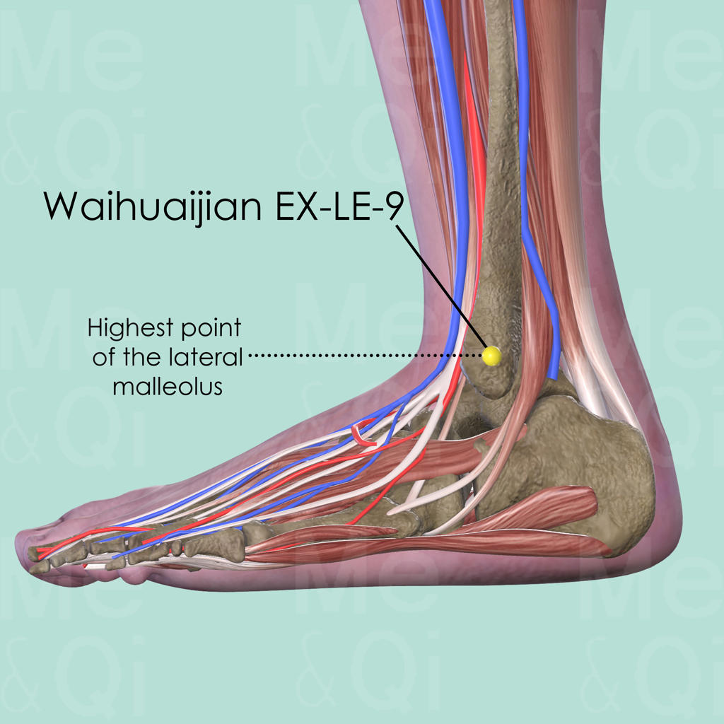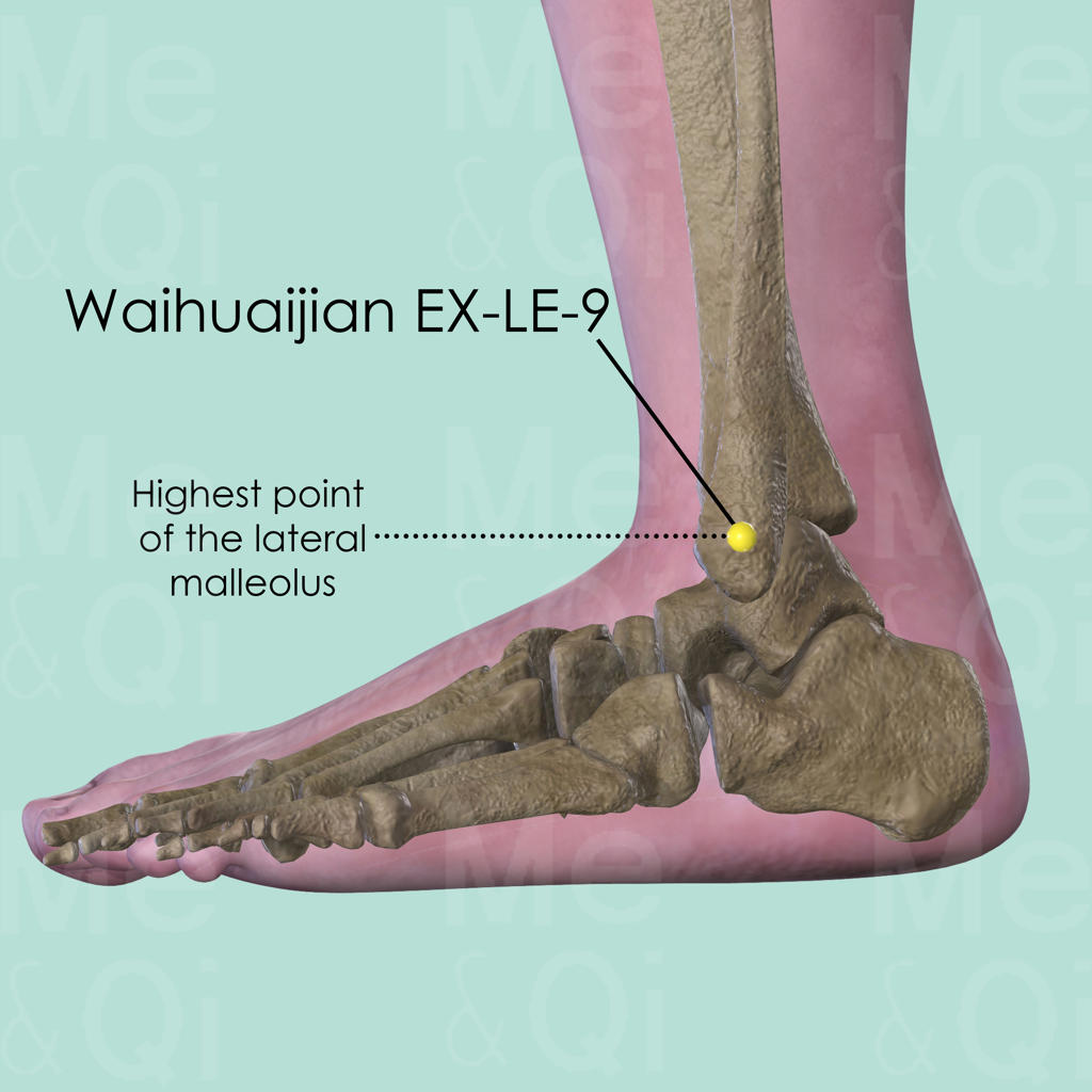 Waihuaijian EX-LE-9 is located on the highest point of the lateral malleolus. On the opposite side, Nehuaijian EX-LE-8 is on the highest point of the medial malleolus.
