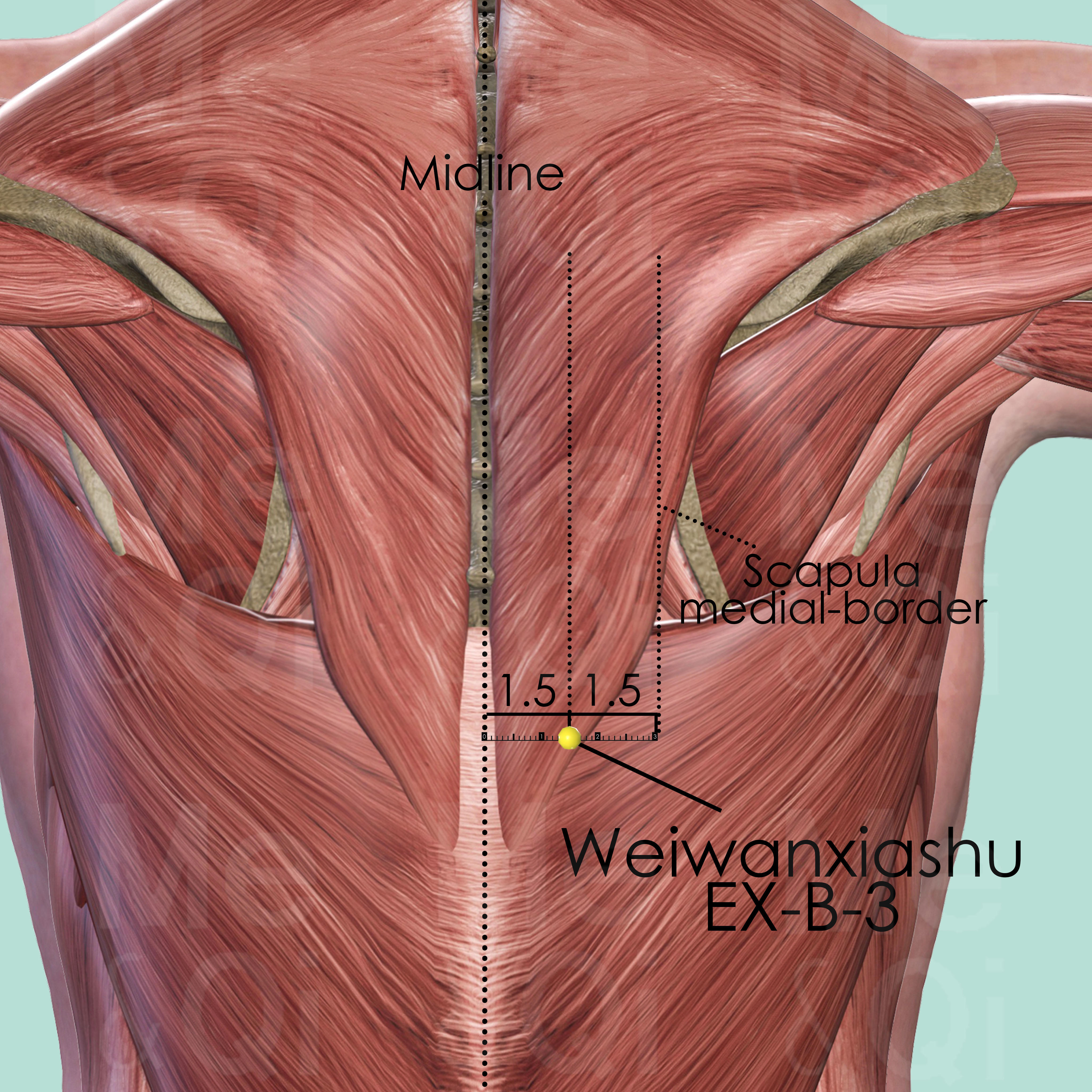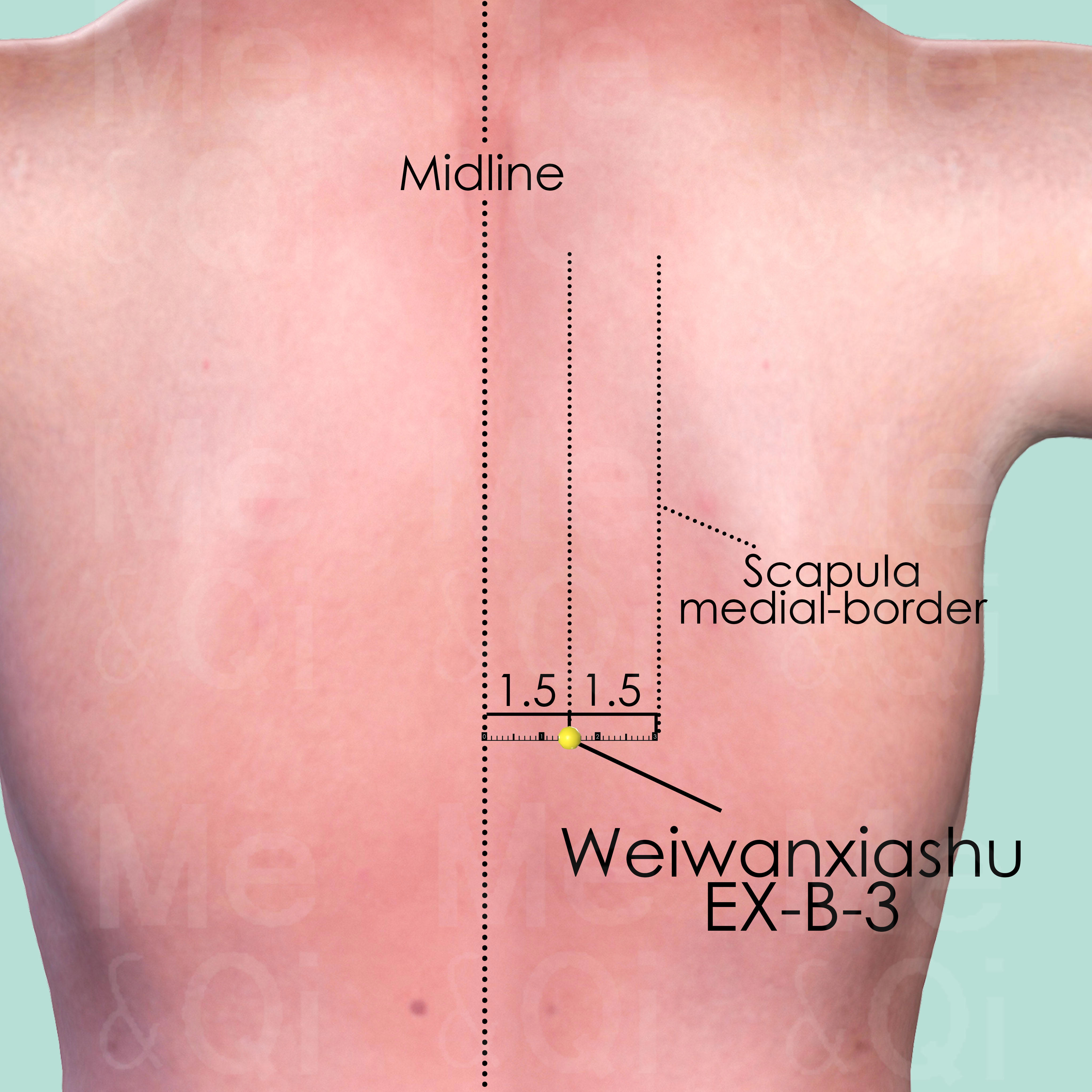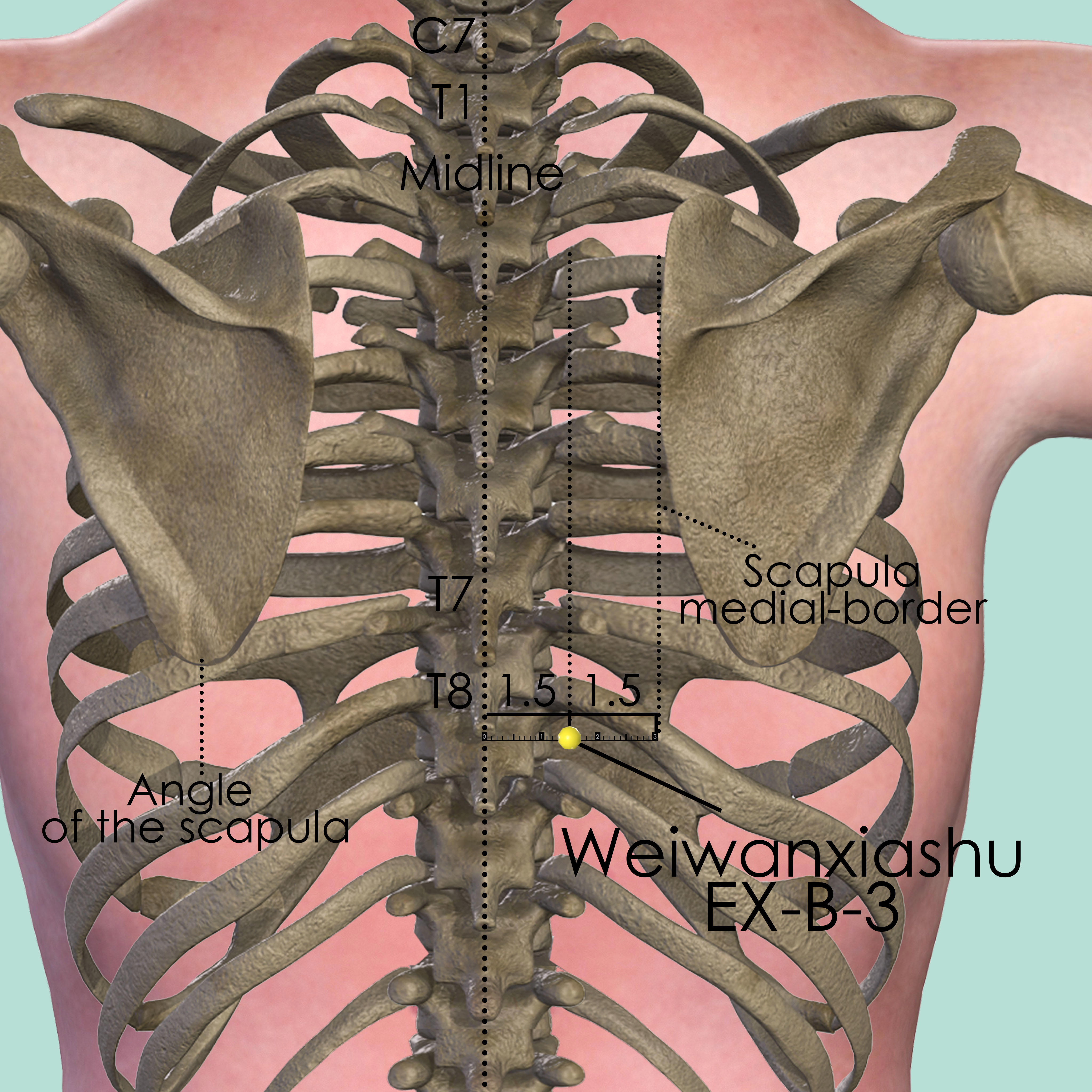 First locate the spinous process of the 7th cervical vertebra (C7), which is still palpable when the neck is being flexed and extended, while the 6th cervical vertebra (C6) starts to slide anteriorly and gradually disappears. The spinous process of the 8th thoracic vertebra (T8) is 8 spinous process below C7. Or first locate the spinous process of T7, which lower end is level with the inferior angle of the scapula, when the patient is seated with their arms hanging down. T8 is 1 thoracic vertebra below. Locate Weiwanxiashu EX-B-3 1.5 cun lateral to lower border of the spinous process of the 8th thoracic vertebra (T8). Use scapula medial border line as a reference as it is 3 cun lateral to the posterior midline.