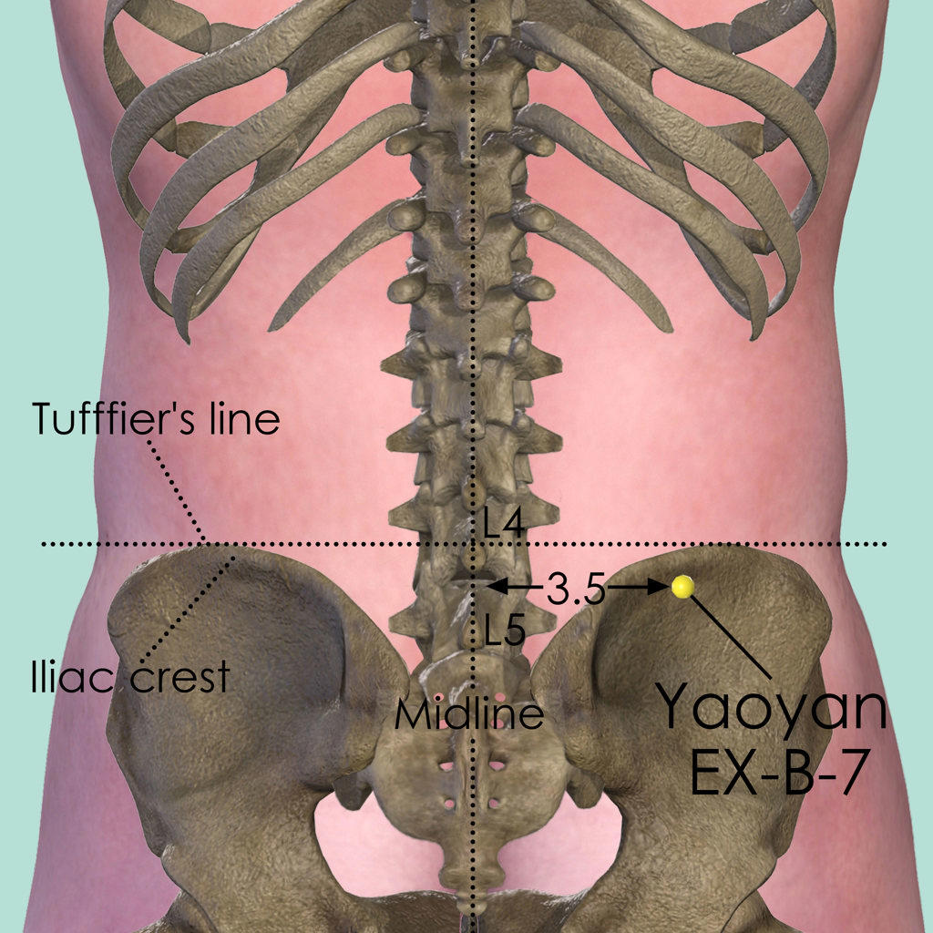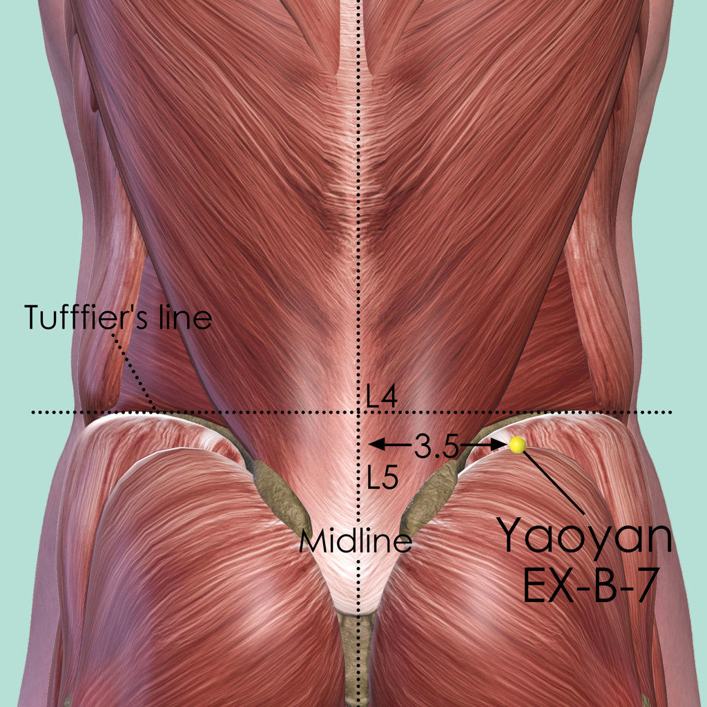First identify the Tuffier's line which connects the highest points of the iliac crest. The spinous process of the 4th lumber vertebra (L4) mostly falls on this line. Yaoyan EX-B-7 is 3.5 cun lateral to the lower border of the spinous process of the 4th lumbar vertebra (L4).