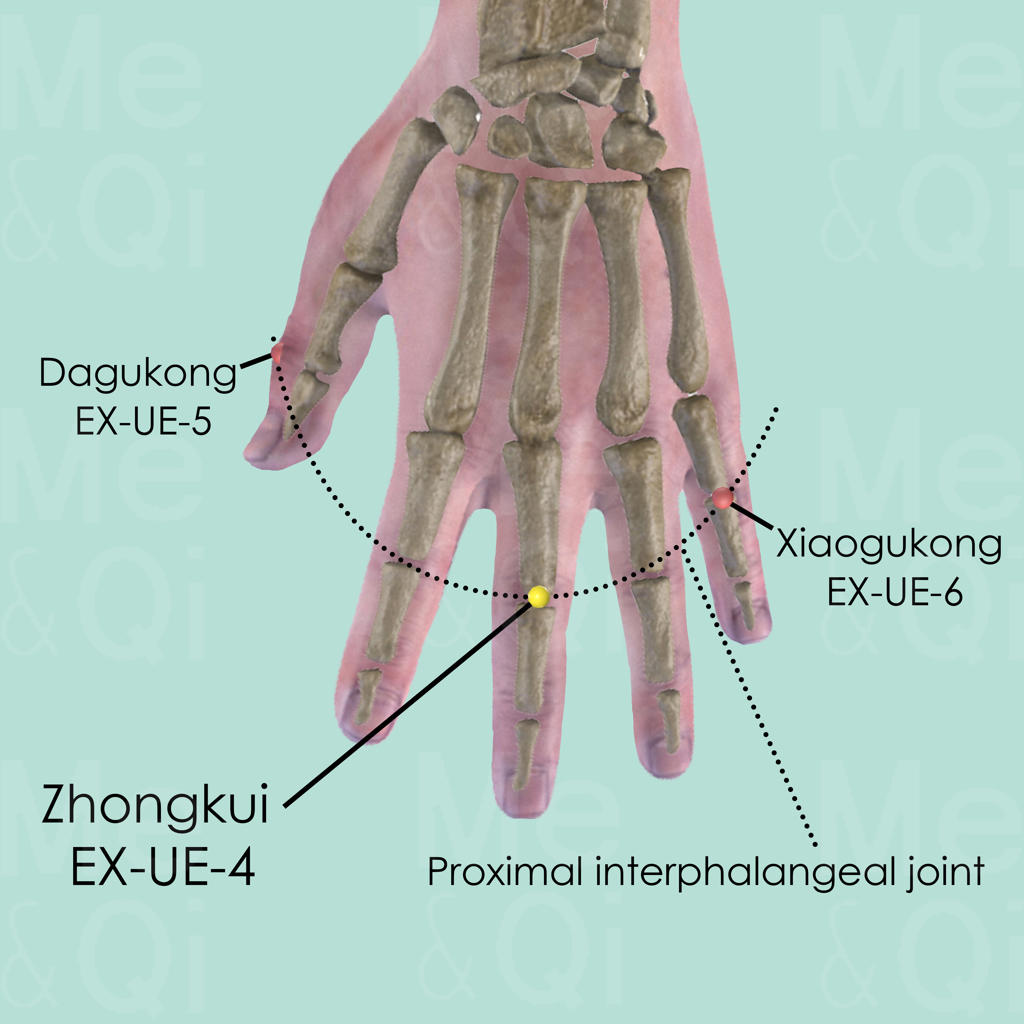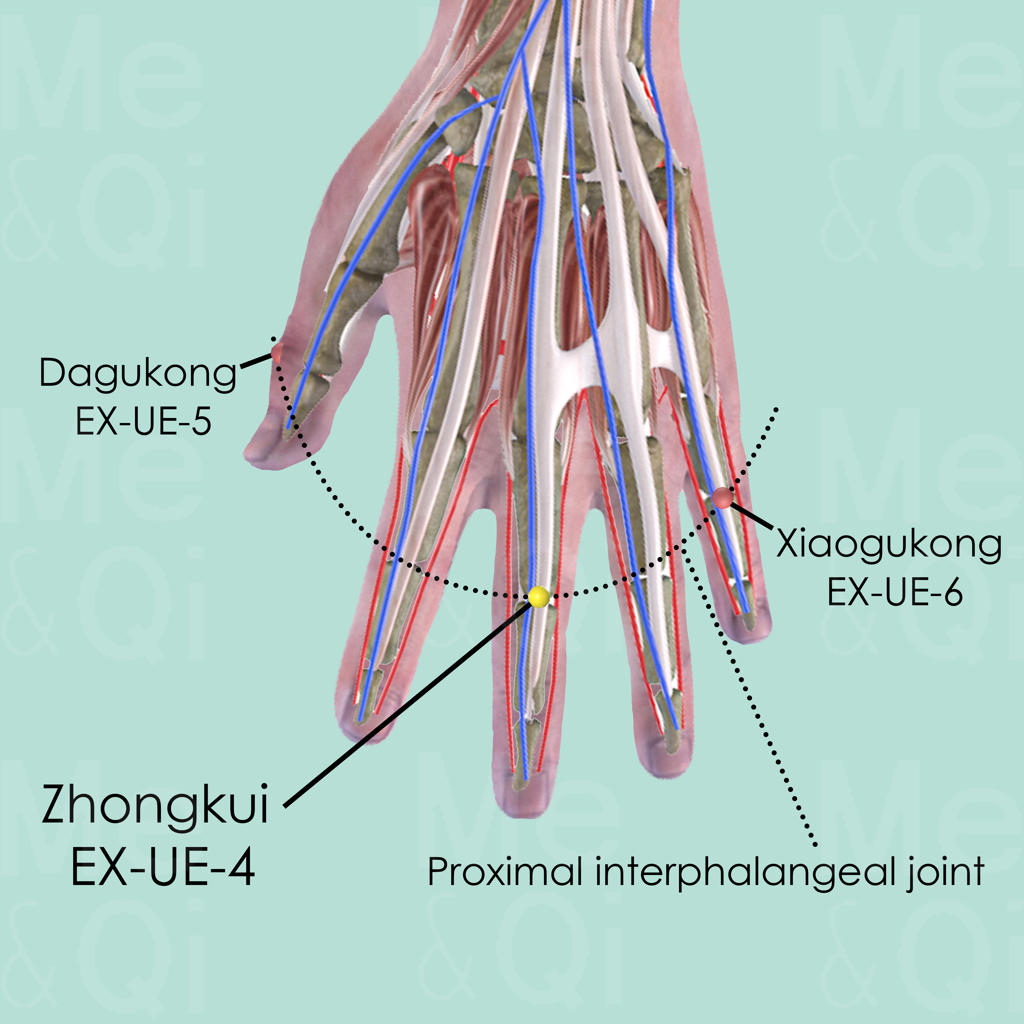 Zhen Jiu Da Cheng (针灸大成): "Zhongkui, two points, on the bone tip of the second segment of the middle finger, found by bending the finger. Treats the five types of dysphagia, rebellious stomach and vomiting food. Apply 7 moxa cones, reducing technique is appropriate."