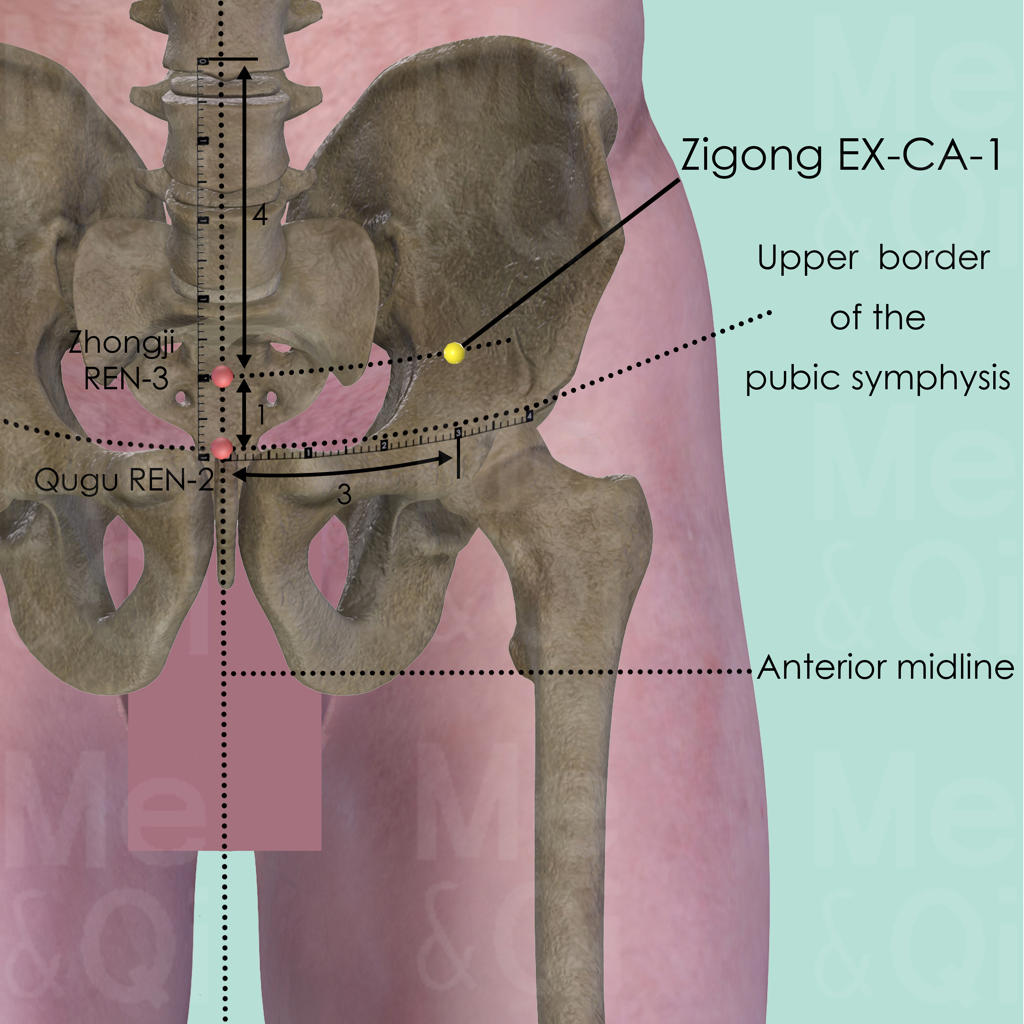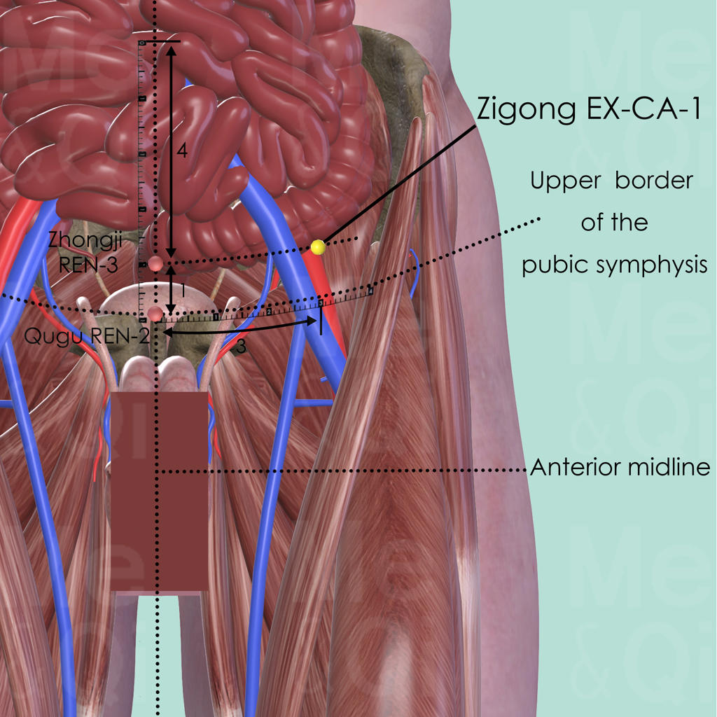 The distance between the upper border of the pubic symphysis and the center of the umbilicus is 5 cun. Zhongji REN-3 is on the anterior midline and 1 cun superior to the upper border of the public symphysis. Zigong EX-CA-1 is 3 cun lateral to Zhongji REN-3.